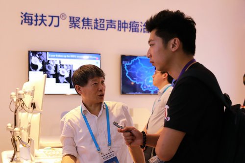 海扶醫療的展臺吸引了大量觀眾駐足參觀,同時也引來了不少媒體的關注。王智彪教授在與媒體記者的對話中說道:“這次活動的主題是科技創新,強國富民。海扶醫療就是這個主題很好的代表。我們的技術,我們的設備是中國人發明的,具有完全自主知識產權,并且我們中國在聚焦超聲治療這個領域領先全球!這是科技創新的結果。前段時間的貿易戰,很可惜,我們就是沒有自主的知識產權,很被動,但如果在聚焦超聲治療領域,我們不怕,我們一定會贏!因為知識產權都在我們這里。我們用自己的高科技讓國家變得強大,變得更有實力。”