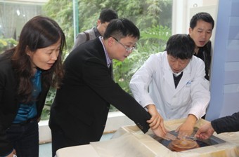 2012年11月20日下午,中央電視臺新聞中心副主任楊華一行,參觀了聚焦超聲消融手術發源地——海扶醫療。王智彪教授陪同楊華主任一行,首先參觀了全國首家子宮肌瘤專病醫院——重慶海扶醫院。王智彪教授詳細介紹了子宮對于女性的重要作用,及目前子宮肌瘤的治療狀況、海扶刀®聚焦超聲腫瘤治療系統治療子宮肌瘤的優勢等,并邀請楊主任一行進入聚焦超聲消融手術治療室,現場觀看海扶刀®聚焦超聲腫瘤治療系統治療子宮肌瘤情景。楊主任認真觀看,仔細聽取王智彪教授介紹,不住點頭,表示贊同。
