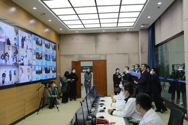 在超聲醫療國家工程研究中心的聚焦超聲消融手術全球協同服務中心,調研人員與川渝兩地使用該技術的四川省人民醫院城東院區、西南醫科大學附屬醫院、遂寧市中心醫院、遂寧市中醫院、綿陽市中心醫院、重慶大學附屬三峽醫院、重醫附二院、重慶海扶醫院在線交流正在實時開展的聚焦超聲消融手術情況。