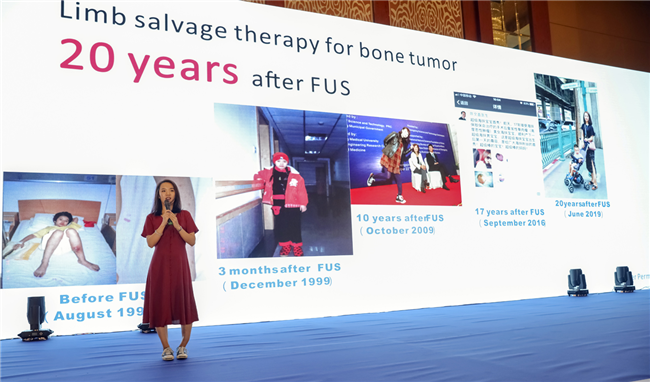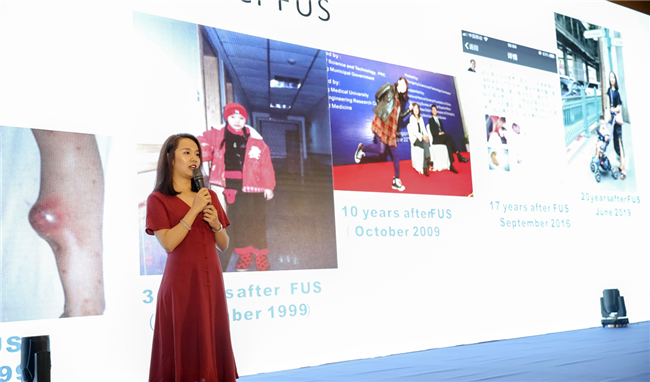 其中一位女士是通過中國重慶海扶的聚焦超聲消融手術保住肢體的骨腫瘤患者。左小腿被診斷出骨腫瘤的時候,她才9歲。正是因為有了聚焦超聲消融手術,她才逃過被截肢的命運。術后20年,她已擁有了自己的家庭和健康的寶寶。如今走上會場的講臺,向嘉賓們展示她保住了的肢體、健康地生活。