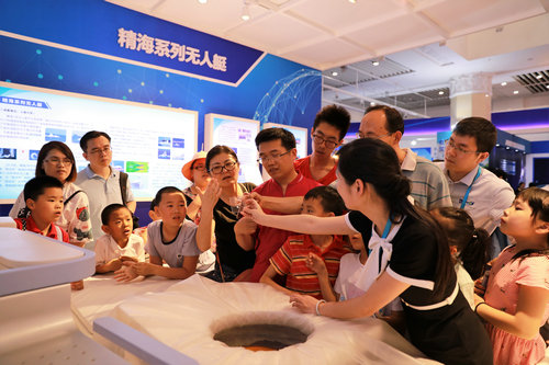 科普周活動上一位家長正在給自己的孩子做講解