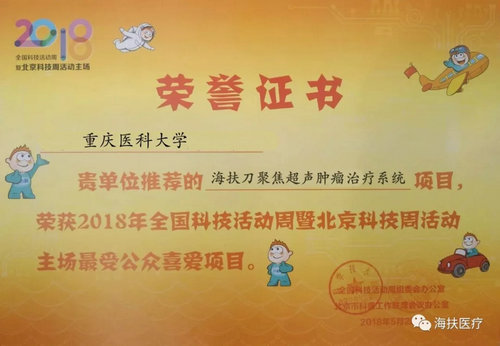 在科普周最后一天下午的頒獎典禮上,海扶醫療榮獲了科普周“最受公眾喜愛”項目獎項。在此次科普周參展的460個項目中,一共有98個項目獲獎。