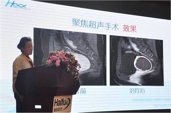 講座中,汪煉院長介紹了重慶海扶醫院遵從的“微無創的治療理念”、“從‘治病’到‘治病人’”、“我的健康我做主”的三大辦院和行醫理念。并做了聚焦超聲消融手術治療子宮肌瘤手術的實時現場直播。