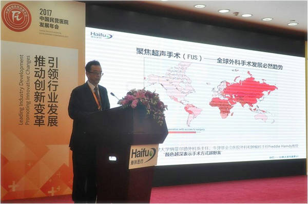 重慶海扶醫療科技股份有限公司總經理蔣鋼作為會議最后的發言嘉賓登場。蔣總首先向大家介紹了現今世界外科手術的發展趨勢,由“大創,到微創,到無創”的手術方式和理念的轉變已經不可阻擋。蔣鋼總經理引用了世界外科手術界排名前三的英國牛津大學Freddy教授的世界手術趨勢分布圖來佐證。