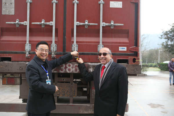 海扶醫(yī)療總經(jīng)理蔣鋼與肯尼亞合作伙伴一起為集裝箱車插上了鉛封,貨車載著全體海扶人的心愿、祝福與承諾啟動(dòng),駛向一片新的大地