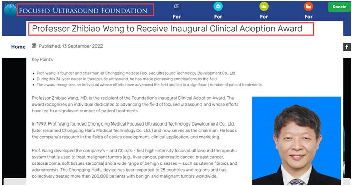 經(jīng)過34年發(fā)展,2022年10月,美國聚焦超聲基金會(huì)為王智彪教授團(tuán)隊(duì)頒發(fā)聚焦超聲“臨床應(yīng)用獎(jiǎng)”,表彰其34年來在聚焦超聲治療領(lǐng)域做出的開創(chuàng)性貢獻(xiàn),包括基礎(chǔ)研究、大型醫(yī)療設(shè)備研發(fā)、臨床應(yīng)用及行業(yè)標(biāo)準(zhǔn)制定等。