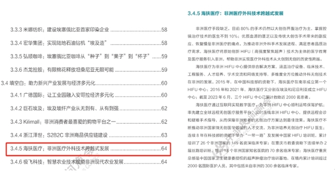 海扶醫療在助力非洲新興產業發展與經濟多元化合作中,以原始創新的HIFU技術為主體及相關醫學教育及醫療服務引入非洲,幫助非洲實現外科手術從大創到無創的偉大跨越,其歷史意義重大,海扶醫療非洲相關項目被入編《中國企業投資非洲報告2023》。