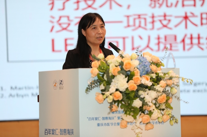 重慶海扶醫院張彩做《聚焦超聲治療在乳腺良惡性腫瘤的應用》講座。聚焦超聲治療乳腺良性腫瘤無傷口,適形治療、一次性治療、保留了乳房的美觀性、治療時間短。在乳腺惡性腫瘤上,提高患者生活質量,緩解疼痛、延長患者生存期。