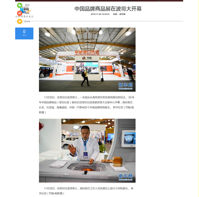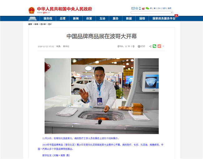 中國政府網也發布這一新聞,對此次中國品牌商品(哥倫比亞)展進行報道,海扶醫療在其列。