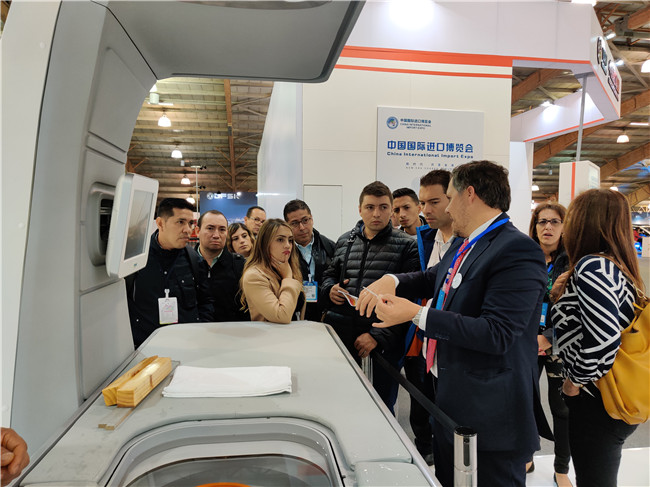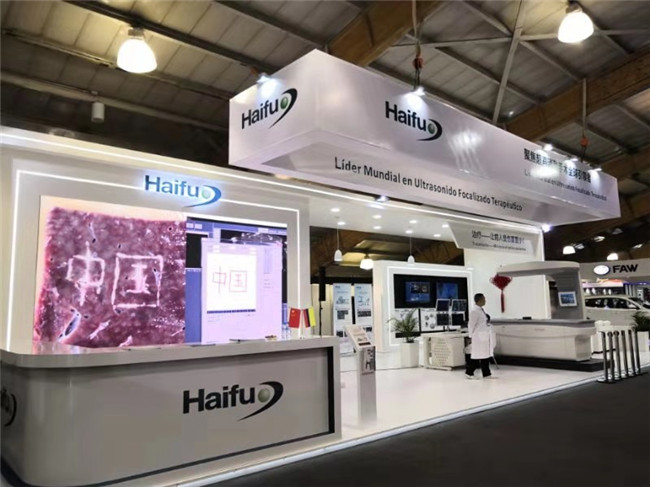 海扶醫療展示的海扶刀®聚焦超聲腫瘤治療系統以及大屏播放的西語視頻,吸引不少觀眾駐足,觀摩聚焦超聲消融手術模擬治療,并親身感受了超聲波穿透手掌將有機玻璃片“消融”,自己的手掌卻毫發無損的“神奇”治療原理,對無創的聚焦超聲消融手術贊嘆不已。